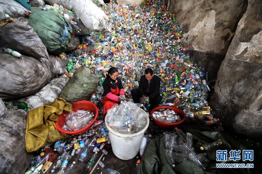 3月5日,朱家谷夫妇在堆积如山的废旧塑料瓶前埋头工作。