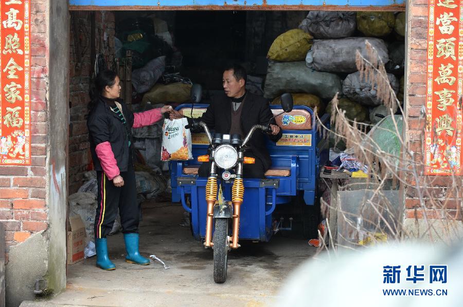 3月5日,朱家谷准备骑电动三轮车出门收废塑料。