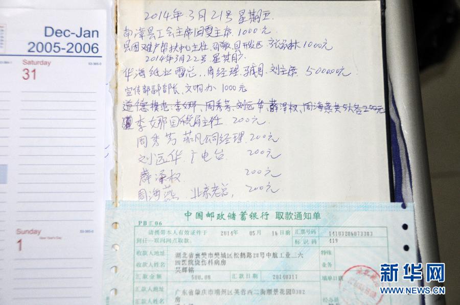 母亲张明荣记下的爱心本,目前社会捐款达到11000元(3月25日摄)。