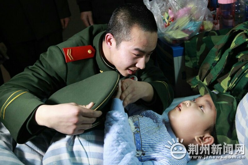 小孝天的心愿是当兵,武警荆州市支队政治处的武警官兵们,特意来到小孝天的病房,来圆孩子当兵的梦想。图片来源:荆州新闻网