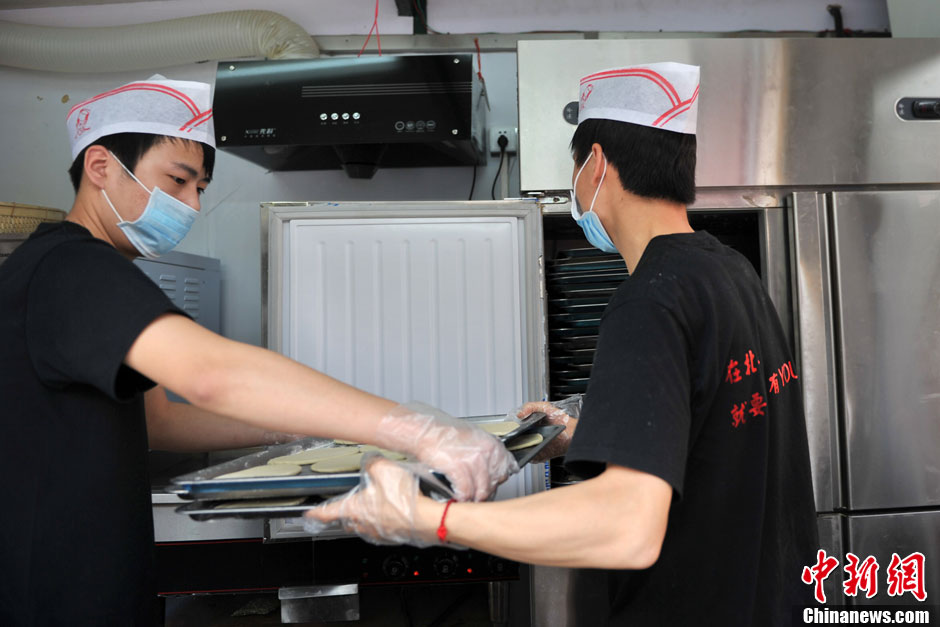 卖完中午的肉夹馍,店员们在吃工作餐的间隙还要忙着为下午备足材料。中新网记者 金硕 摄