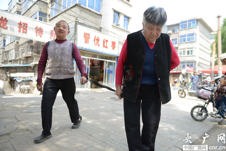 2014年5月6日,在山西省太原市东安路上,80岁的席桂兰老人佝偻着身子挪动脚步,步履蹒跚。她的右手上牵着一根绳子,绳子的那头,是她蹦跳傻笑的24岁智障孙子。她身后是患有精神疾病和癫痫的51岁的儿子。