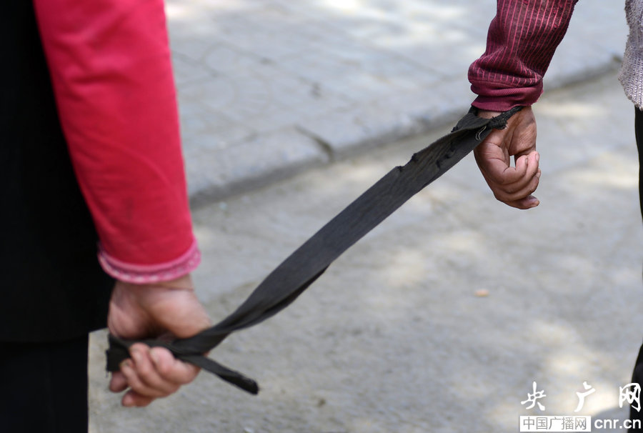 2014年5月6日,在山西省太原市东安路上,80岁的席桂兰老人佝偻着身子挪动脚步,步履蹒跚。她的右手上牵着一根绳子,绳子的那头,是她蹦跳傻笑的24岁智障孙子。她身后是患有精神疾病和癫痫的51岁的儿子。