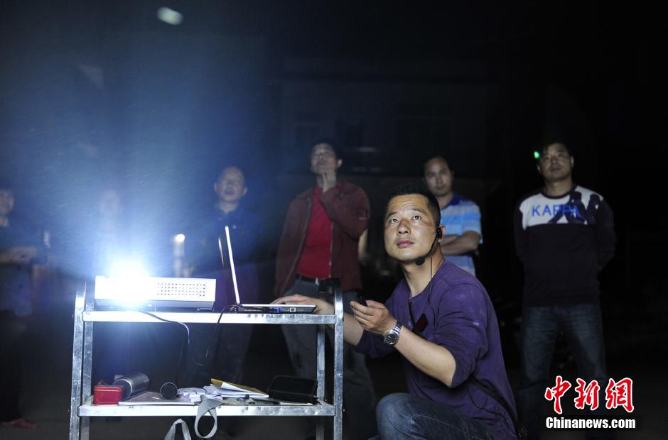 张志辉(前一)用投影仪在给农户们播放农业技术知识的影片。邵颖 摄