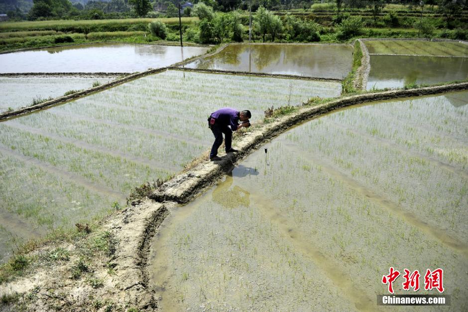 张志辉用相机记录水稻示范田里土壤酸碱变化的数值。邵颖 摄