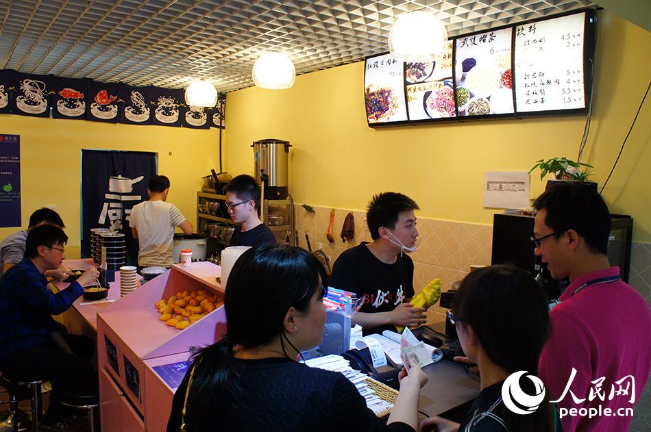 5月16日中午,张天一和他的3个伙伴正在米粉店中忙碌。(人民网记者 翁奇羽 摄)
