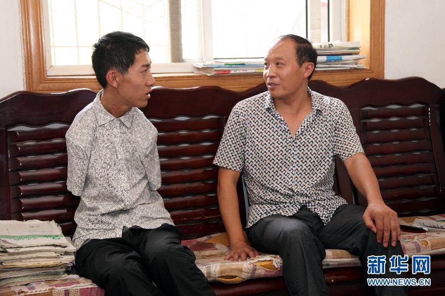 6月5日,无臂男孩彭超的父亲(右)鼓励儿子轻松面对高考。 19岁的彭超是四川省攀枝花市第七高级中学高三(6)班的学生,6岁那年不慎被高压变压器击中,失去双臂。坚强的彭超并未向命运低头,他乐观面对生活,克服常人难以想象的困难,通过艰辛训练学会了用脚穿衣、写字、上网等,日常生活起居基本能够自理。班主任老师孔荣介绍说,彭超的成绩在全年级排名靠前,用脚写字做题的速度不比正常人差,每次模拟考试总分均超过重本线二三十分,但他对现在的成绩并不满意。他希望通过自身努力,实现去北方高等院校土木工程系上大学的梦想。新华社发(王川源 摄)