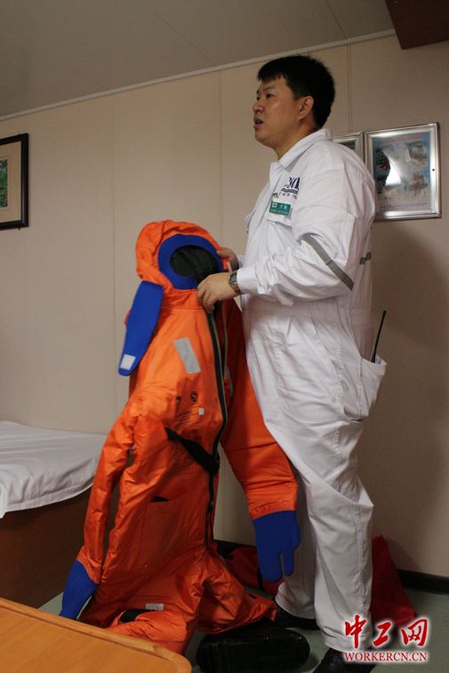 “中海之夏”大副周成果给记者讲解逃生设备 中工网记者 王莹摄