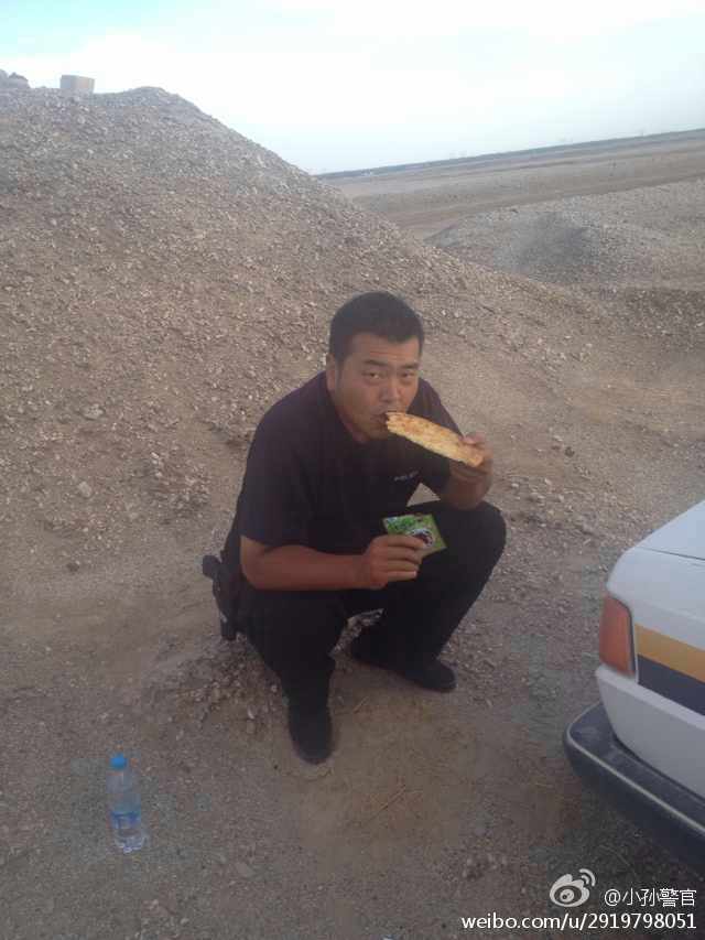 为执行搜捕任务七天七夜未下山的新疆民警,一位民警正在吃馕和海带丝泡菜。