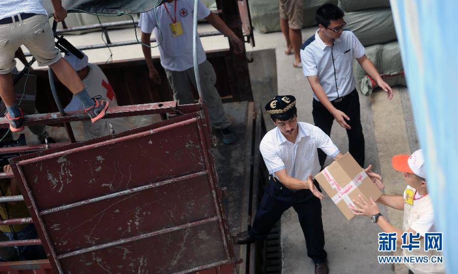 8月5日,阿迪力(前右)和工作人员一起将切糕搬上货车。云南省昭通市6.5级地震发生后,灾情牵动了三位切糕合伙人。8月5日,“切糕王子”阿迪力·买买提吐热和他的另外两位合伙人蒋金亚、蒋春杨一起,以他们注册的湖南梦想起航电子商务有限公司的名义向鲁甸地震灾区捐赠5吨切糕。因为切糕作为干粮保质期长,食用方便且能量高,适合灾区群众食用,他们在得到地震消息后便紧急赶制切糕。 5日下午,重达5吨、价值50万元的切糕全部装车完毕,“切糕王子”阿迪力将亲赴灾区,将美味的切糕送到受灾群众手中。 新华社记者 李尕 摄