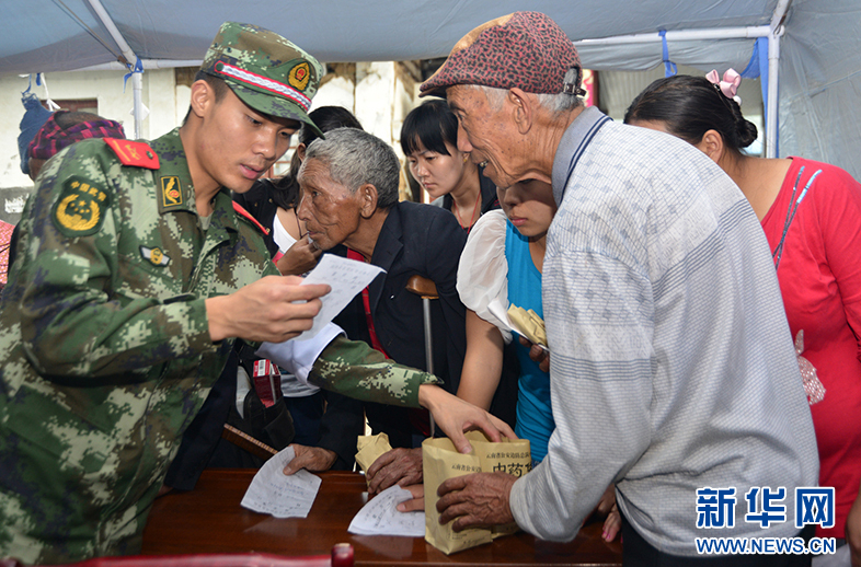 资料图:谢樵为灾区群众发放中药。何冬华 摄