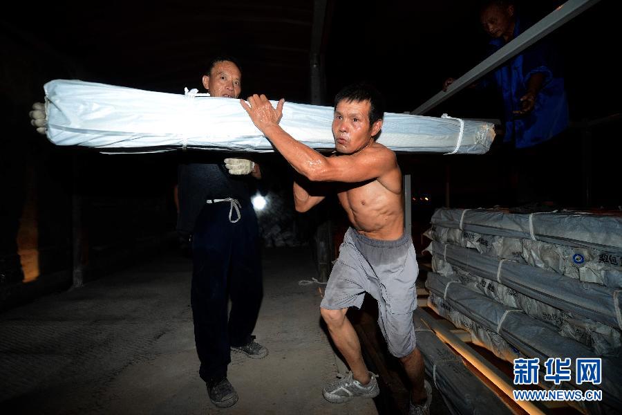 8月4日晚,在合肥货运北站物流基地内,工人正在将帐篷装车。当日,安徽省民政厅接民政部通知要求,为支援云南地震灾区,民政部救灾物资合肥储备库紧急调拨2500顶帐篷至云南,预计8月5日凌晨完成装车并发送。新华社记者 张端 摄