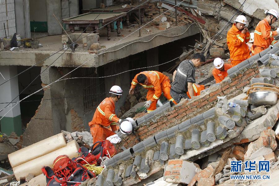 8月5日,救援人员在云南省鲁甸县龙头山镇进行救援。 8月3日16时30分,云南省昭通市鲁甸县发生6.5级地震。截至8月4日14时,地震造成昭通市鲁甸县、巧家县、昭阳区和曲靖市会泽县108.84万人受灾、398人死亡。新华社记者 邢广利摄