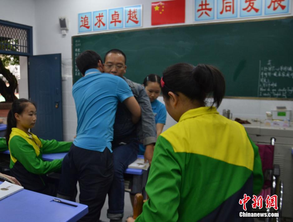 9月1日,开学第一天,四川省泸州市第七中学的教室里,詹光伟老师只能坐在课桌上授课,细心的同学发现,老师的手已经很少抬起。在刚刚过去的暑假里,一项名为“冰桶挑战”的公益活动传遍全球。詹光伟便是该活动的主角——运动神经元进行性肌肉萎缩症患者,俗称渐冻人。21年前的今天,意气风发的詹光伟迈出大学校门后正式踏上讲台。从独立行走到搀扶挪动,再到今天的寸步难行,他人生所有的时光和美好都在这里。图为学生帮助詹光伟老师坐上课桌讲课。中新社发 周亚强 摄