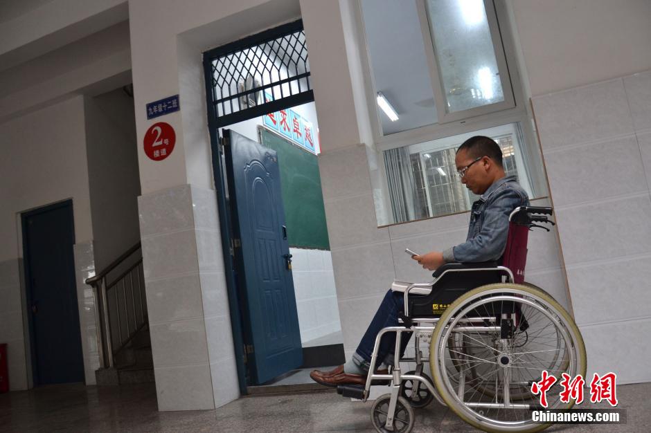 9月1日,开学第一天,四川省泸州市第七中学的教室里,詹光伟老师只能坐在课桌上授课,细心的同学发现,老师的手已经很少抬起。在刚刚过去的暑假里,一项名为“冰桶挑战”的公益活动传遍全球。詹光伟便是该活动的主角——运动神经元进行性肌肉萎缩症患者,俗称渐冻人。21年前的今天,意气风发的詹光伟迈出大学校门后正式踏上讲台。从独立行走到搀扶挪动,再到今天的寸步难行,他人生所有的时光和美好都在这里。图为詹光伟在教室外等待上课。中新社发 周亚强 摄