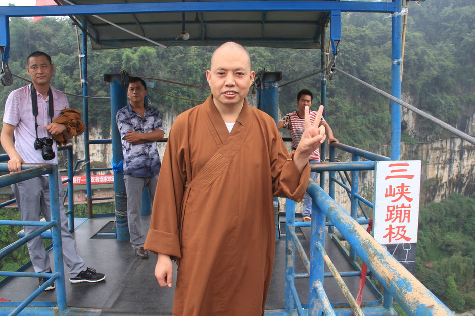 2014年9月9日,湖北省宜昌市,“最萌法师”延参带着弟子恒东、恒庄来到西陵峡风景区,挑战蹦极和溜索等极限运动,引起众多游客的围观。据了解,这个蹦极高度达61米,曾被誉为“中国第一跳”。图为因恐高,延参法师放弃了蹦极,而是让自己的弟子去挑战。