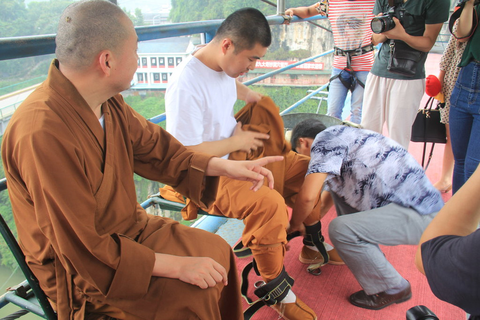 在游玩的同时,延参法师还不忘吟诗一首:“坐看白云生远峰,浮世一回禅心空。他年若问难忘事,曾做西陵峡中人。”图为延参法师的弟子在做蹦极前准备。