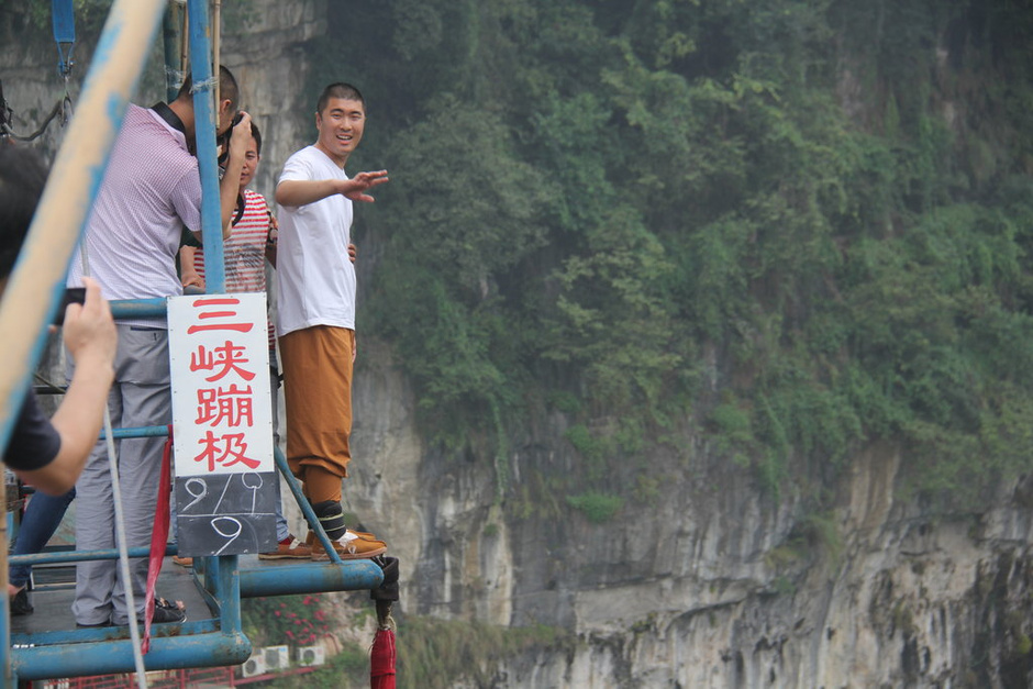 延参法师的弟子恒东蹦极前,与师傅打招呼