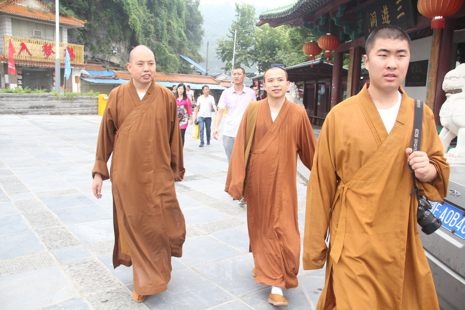 延参带着弟子恒东、恒庄来到西陵峡风景区,挑战蹦极和溜索等极限运动,引起众多游客的围观。