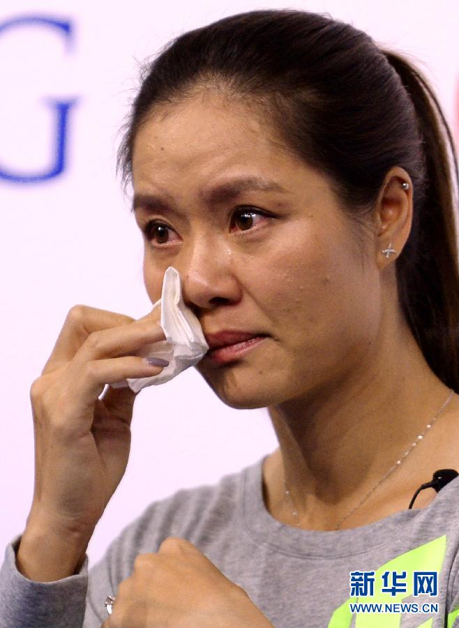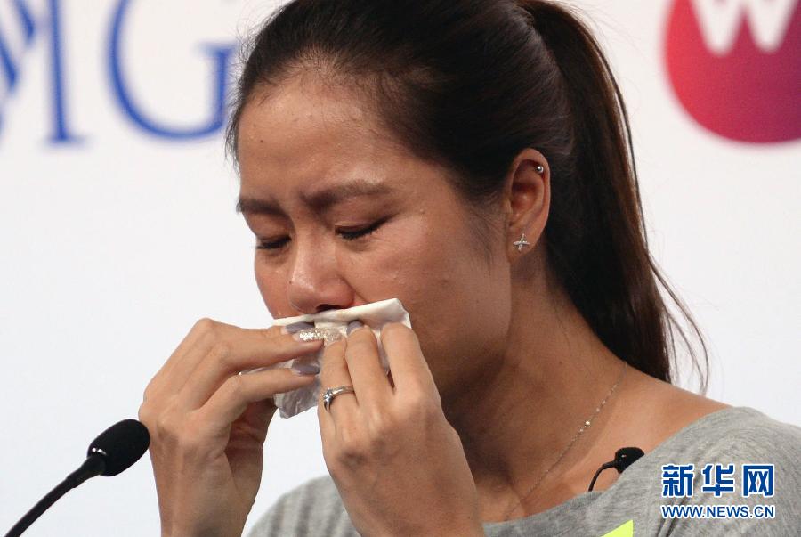 9月21日,李娜在发布会上擦眼泪。当日,中国著名女子网球运动员李娜在国家网球中心召开退役新闻发布会。本月19日,李娜通过社交网络宣布退役。 新华社记者陈晔华摄