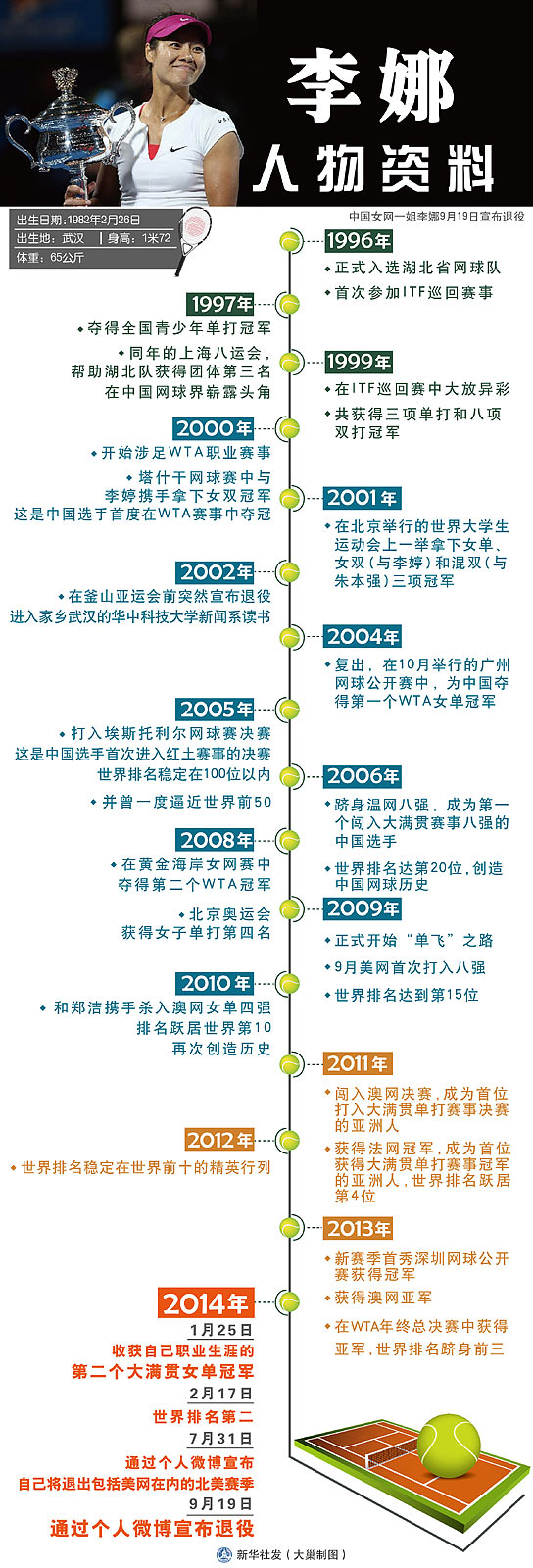 图表:中国网坛“一姐”李娜宣布因膝伤退役 新华社发 大巢制图