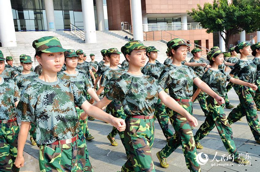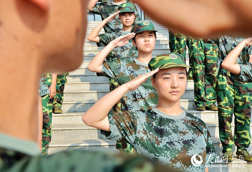 今年华南理工大学艺术学院的军训工作是由来自广州边防指挥学校的学员负责。接近中午,天气越来越热,高温下的雪婷和同伴们还是认真聆听教官的讲解,争取每个动作都做到位。图为雪婷和同伴们正在教官的示范下敬军礼。