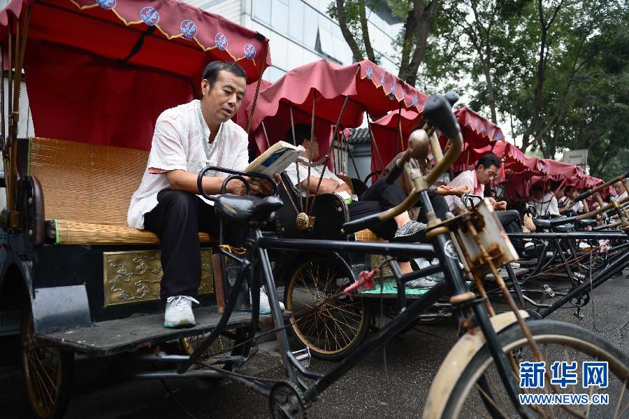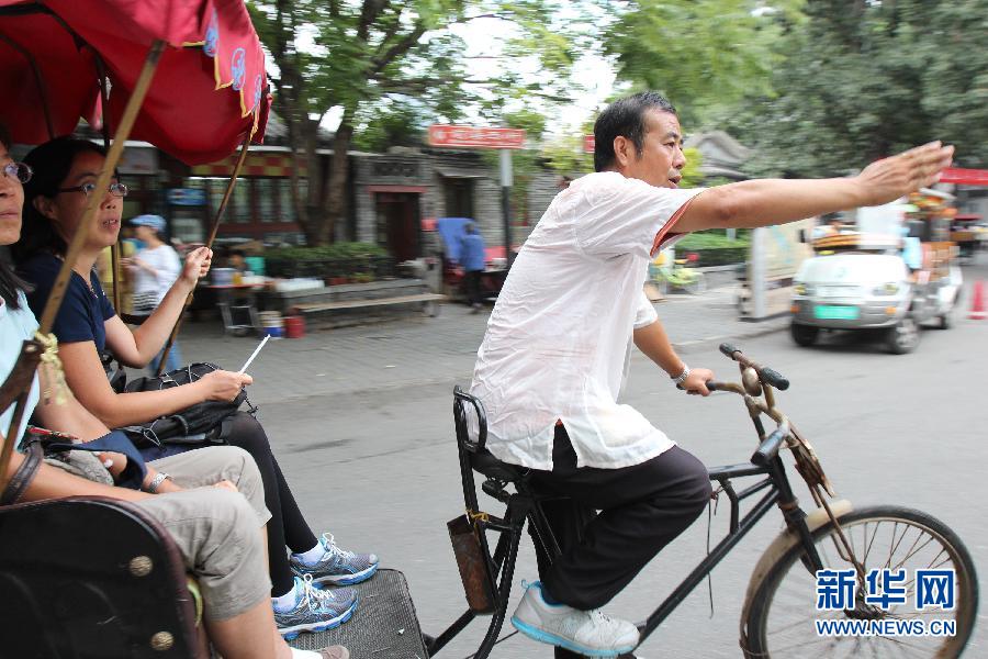 曹俊来边踏三轮车边为游客讲解北京胡同文化(9月12日摄)。新华社记者 马平 摄