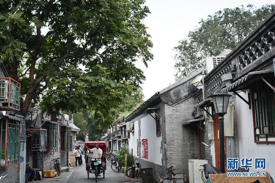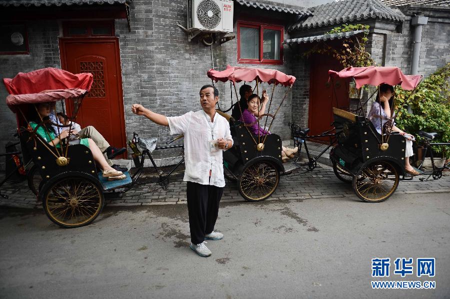 9月12日,曹俊来蹬着三轮车给游客介绍胡同文化(9月12日摄)。新华社记者 张端 摄