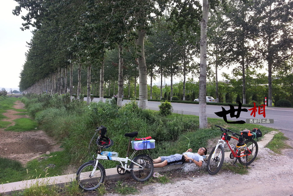 他的这个想法和同院子的好朋友刘超一拍即合。很快,两人便集散成团。今年8月20日,他们从西安出发,前往朝鲜的新义州。图为:马上到烟台的时候,刘超有点累了,便躺在路边休息——这是他们旅途中的常态。