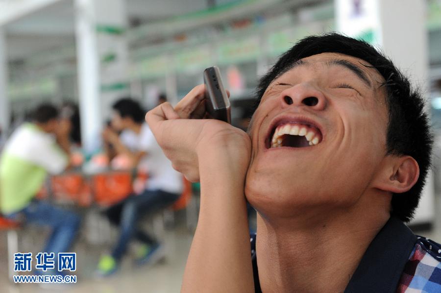 9月6日,一到大学,李刚就打电话向母亲报平安。 22岁的李刚是安徽省太和县人,在五、六个月大时被确诊为脑瘫,10岁时在李刚的强烈要求下,父亲才勉强答应让他上学。今年,李刚参加高考并被安徽省亳州职业技术学院中药专业录取。李刚能考上大学付出了比常人更多的艰辛,他曾经仅仅练习写自己的名字就花费了两个月时间。对面这样一名特殊学生,亳州职业技术学院把李刚所在班级的教室调到了一楼,安排专门人员对他进行照顾,免除其学费,还为他积极争取国家助学金、特困生生活补助,同时学校食堂免费供应他伙食,同宿舍的同学也自动承担了照顾他的责任。李刚不屈不挠、积极向上的精神令同学们非常感动,在校园里他被大家亲切地称为“刚强哥”。 新华社发(张延林 摄)