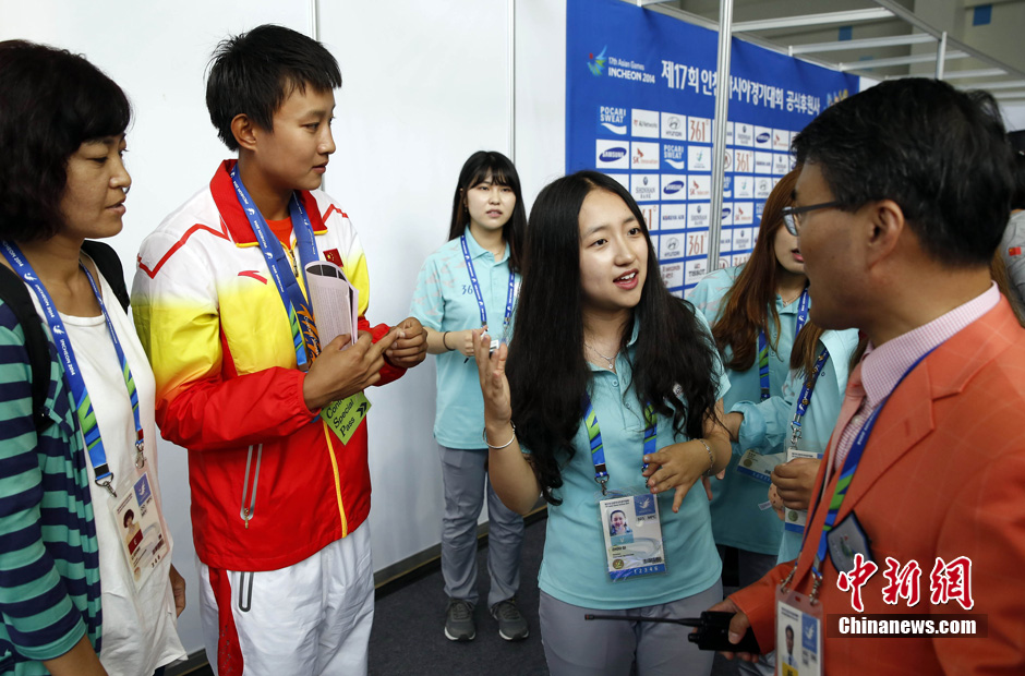 9月28日,仁川亚运会沙排赛场的留学生志愿者周琦在为运动员做翻译。中新社记者 汤彦俊 摄
