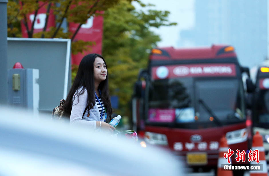 9月28日,仁川亚运会沙排赛场的留学生志愿者周琦在路边等车准备回家。中新社记者 汤彦俊 摄