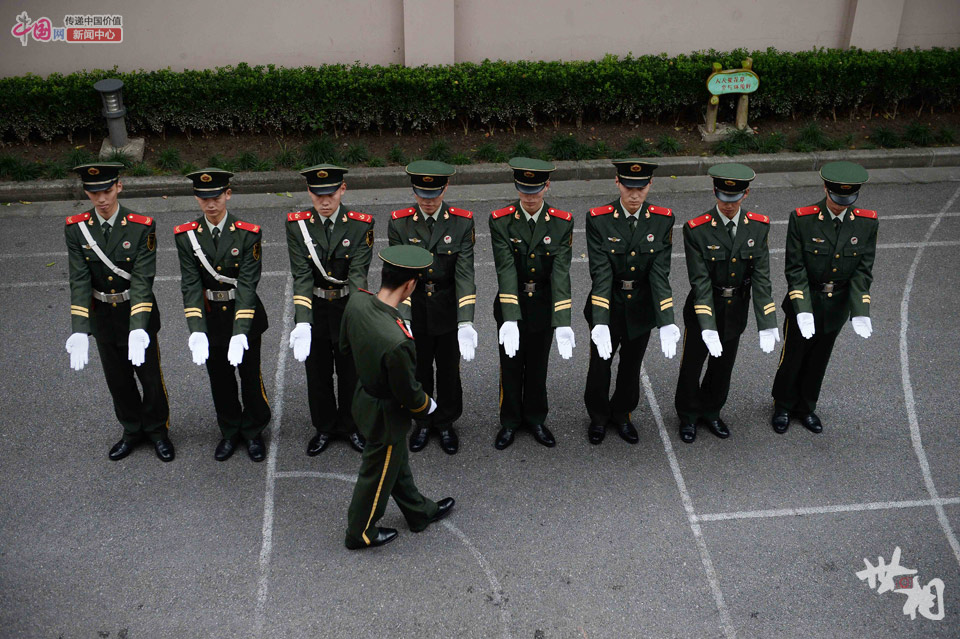 战士们在降旗仪式前整理军容。
