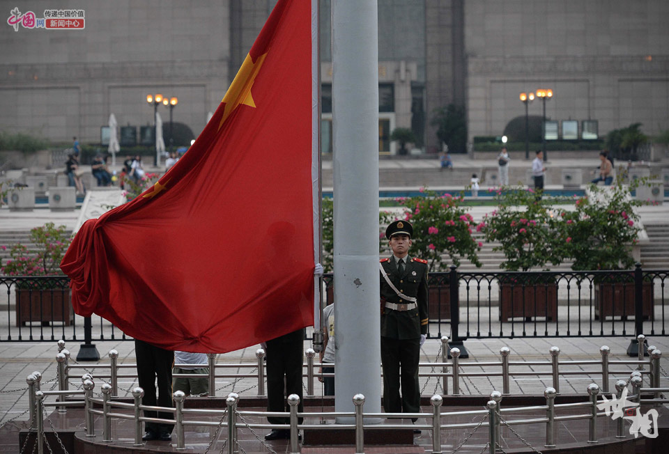 升旗手林孝诚(左一)和战友们将上海人民广场的国旗降下。