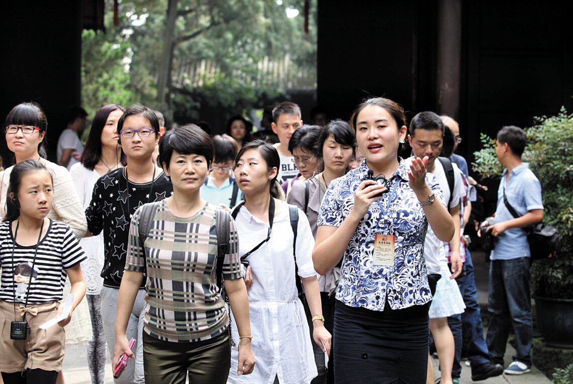 面对猛然增多的游客,成都武侯祠工作人员依然热情而耐心地讲解。