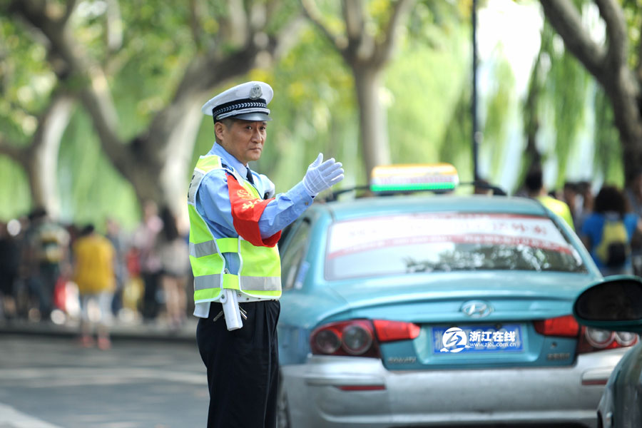 今年国庆假期,杭州交警部门全部警力参与执勤,保障城区特别是西湖景区道路畅通。