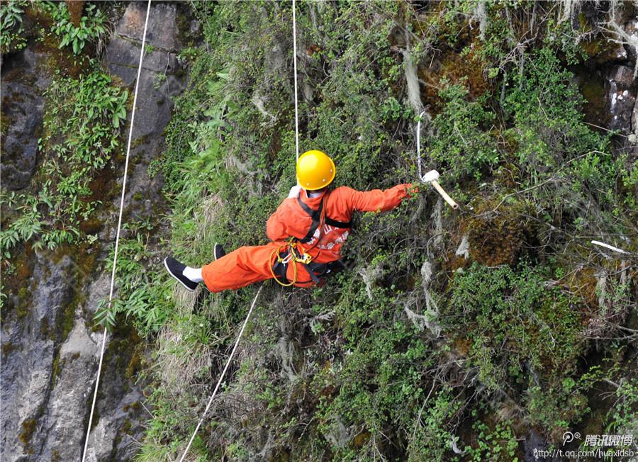 记者了解到,彭文才下到崖壁最深的地方有200多米,往返作业一次一般都在3小时左右,每年下崖80多次,每年清理悬崖的垃圾3吨多。图片来源:华西都市报官方微博