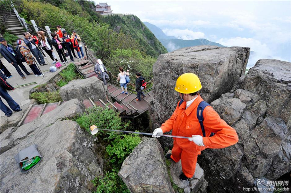 彭文才在捡拾垃圾。图片来源:华西都市报官方微博