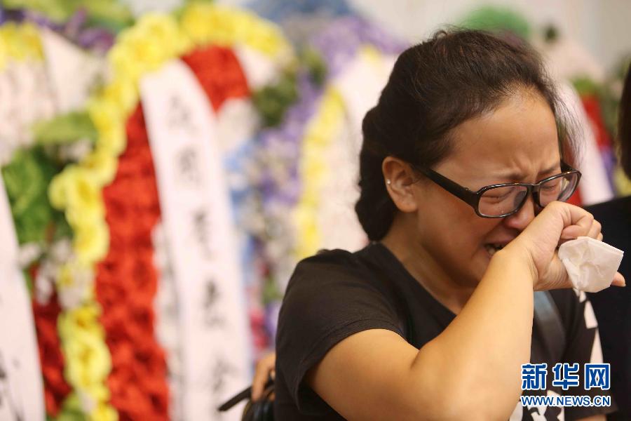 10月10日,获救男童的母亲向女教师胡小丽遗体挥泪告别。新华社发(庄颖昶 摄)