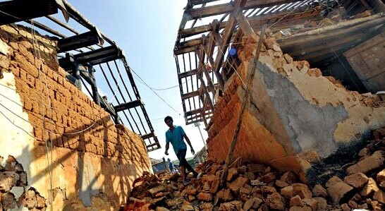 震中芒费村七七村小组,墙体垮塌,但房屋依然矗立。李进红摄