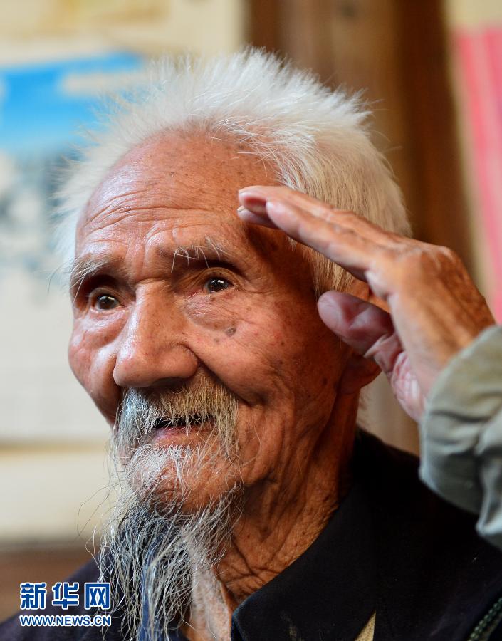这是老红军刘金金(10月18日摄)。刘金金是一位参加过红军长征的老兵。1914年,他出生在长汀,今年正好100岁。1934年,20岁的刘金金正式加入红军。同年10月,刘金金所在的34师从于都出发长征。11月,惨烈的湘江战役打响。红34师浴血奋战,最终弹尽粮绝,被截断在湘江东岸。刘金金在撤退途中受伤,被部队送到当地群众家隐藏疗养。新华社记者 魏培全 摄