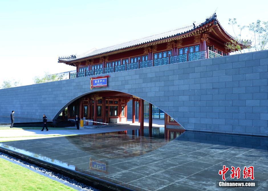 11月3日,部分媒体记者应邀前往位于北京市怀柔雁栖湖畔的2014年亚太经合组织(APEC)领导人非正式会议会场采访,图为中式城楼风格的新闻中心入口。 中新社发 侯宇 摄