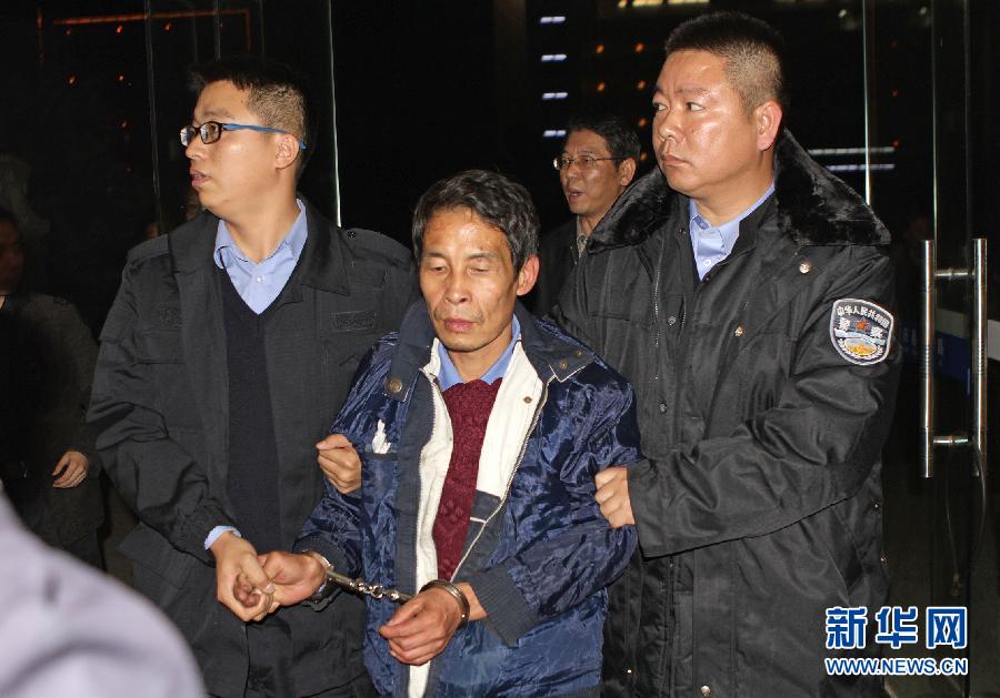 11月4日,嫌犯张样喜被缉捕人员押往弋阳县公安局。经警方证实,江西弋阳县砍杀3名小学生,导致2死1重伤的嫌犯张样喜,已于4日17时40分左右被警方抓获。 10月31日上午11时45分左右,江西省上饶市弋阳县圭峰镇罗家村3名一年级小学生在放学回家途中被一男子砍杀,致2死1重伤。新华社发(彭俊 摄)