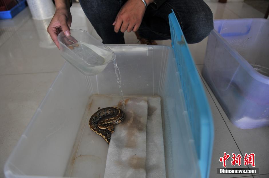 12月2日,白拓在昆明的家中检查蛇的情况,为蛇加水加暖。中新社发 任东 摄