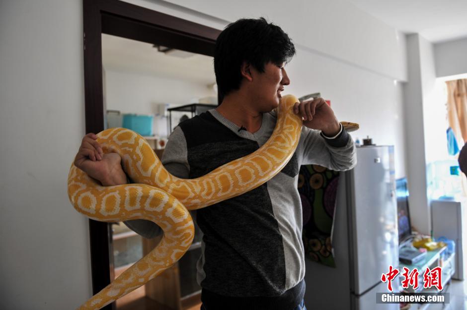 12月2日,白拓在昆明的家中与蟒蛇玩耍。中新社发 任东 摄