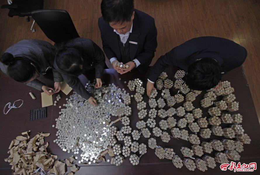 这次,小李送来的硬币,都是1元的,且都已经捆扎完毕。银行的工作人员首先进行了初步的盘点,然后把硬币运到了柜台里,监视器的监督下,逐一拆包,进行清点。