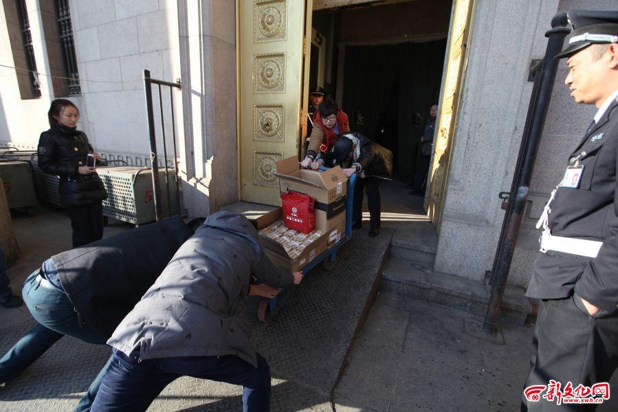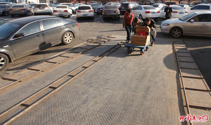 5万枚1元硬币重达600多斤,把钱运进银行是个大工程。小李和随行的两个朋友把硬币装到银行借用的一辆平板车上,通过一处坡道推进银行大门。来源:新文化网