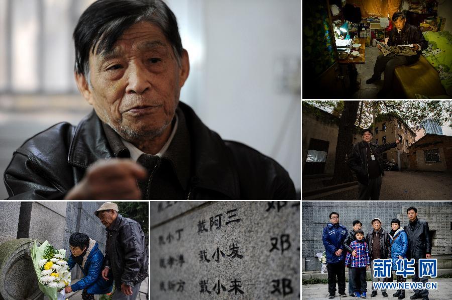 常志强在家中回忆亲人被日军杀害的情形(左上,11月26日摄);常志强在自己家中看报(右上,11月26日摄);常志强在南京小王府巷指认当时亲人被日军杀害的地点(右中,12月1日摄);常志强和女儿常小梅在家祭中向当年遇难的亲人献花(左下,12月7日摄);纪念馆“哭墙”上刻有常志强遇难亲人的姓名,常志强本姓戴,后改姓(下中,12月7日摄);外孙李帆超(左一)、儿媳夏桂芳(左二)、重孙姚思远(左三)、常志强以及女儿常小梅(左五)、女婿李贵清(左六)在“哭墙”前合影(右下,12月7日摄)(拼版照片)。