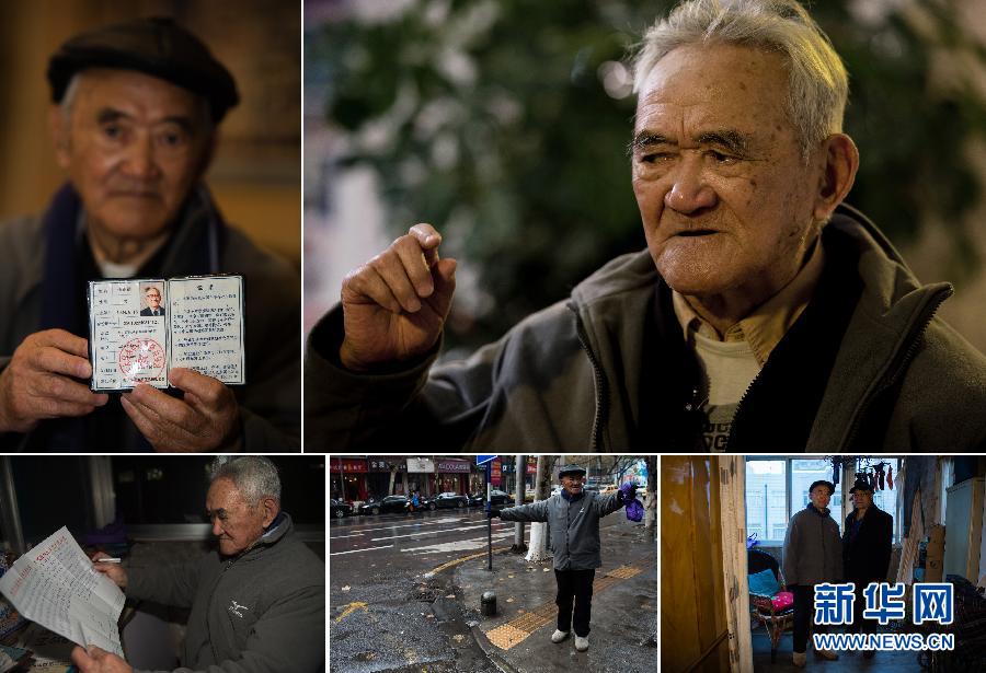 当年13岁的伍正禧和全家人在南京新华巷62号避难时,凶恶的日本兵将其二哥和表哥、表叔抓走并枪杀。他的爷爷被刀捅死,30岁的表娘被强奸。伍正禧在讲述当年爷爷被侵华日军杀害的情形(右上);伍正禧在展示他的南京大屠杀幸存者证书(左上);伍正禧在家中撰写南京大屠杀期间自己的经历(左下);伍正禧在南京丹凤街指认当年自家的所在位置(下中);伍正禧和儿子伍必亮在南京家中合影(右下)(拼版照片,11月27日摄)。