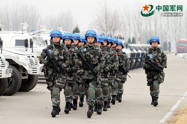 12月22日上午,中国首支维和步兵营维和出征誓师大会在济南军区某摩步旅举行。这是我国首次派出整建制的步兵营参加联合国维和行动。引人瞩目的是,维和步兵营中13名女兵精彩亮相,她们将与男兵共同执行巡逻警戒、人道主义救援等维和任务,这是中国走出国门执行国际维和任务的第一支女子步兵班。